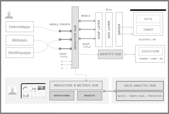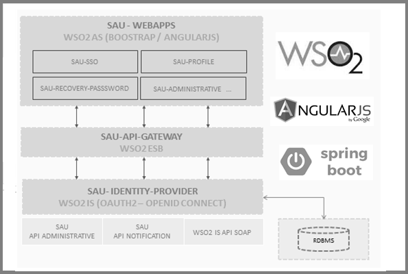 WSO2 Identity Server, WSO2 Enterprise Service Bus y Apache CXF-Spring proporcionó las bases técnicas para estandarizar la gestión de identidades para APIS y Servicios proxys SOAP y Apache CXF para el desarrollo de servicios seguros mediante certificados X509.