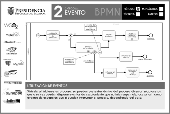 Modelamos y automatizados sus procesos de negocio y operacionales basado en la creación de prototipos, entrevistas, historias y herramientas como el Canvas de procesos, BPM Engines como Bonita BPM, Activiti, Camunda o WSO2 BPS y el estándar BPMN (Business Modeling Notation) en su versión 2.0.